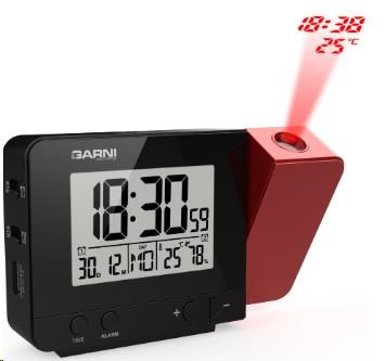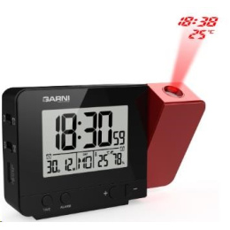 Digitální budík s projekcí času a vnitřní teploty s LCD displejem, časem řízeným rádiovým signálem DCF-77 a měřením vnitřní teploty a relativní vlhkosti LCD displej o rozměrech 63 x 42 mm s možností stálého osvětlení při napájení síťovým adaptérem, nebo krátkodobým osvětlením na 8 s při napájení bateriemi 3 stupně jasu osvětlení displeje, možnost vypnutí osvětlení displeje (při napájení síťovým adaptérem) velikost číslic na displeji – čas 25 mm, datum, zkratka názvu dne, vnitřní teplota a rel. vlhkost 8,5 mm čas a datum řízené signálem DCF-77 s možností manuálního nastavení ikona příjmu signálu DCF-77 zkratka názvu dne 12ti, nebo 24 hodinový formát zobrazení času možnost nastavení časového pásma od -12 do +12 hodin budík s 2 budícími časy s funkcí opakovaného buzení (Snooze) po 5 minutách budící signál - 10 sekund 1 pípnutí za sekundu, 10 sekund 2 pípnutí za sekundu, 10 sekund 4 pípnutí za sekundu a poté stálé pípání projekce času a vnitřní teploty s možností otočení obrazu o 180°, možnost sklopení tubusu projektoru o 90° dopředu a dozadu barva projekce červená stálá projekce při napájení síťovým adaptérem s možností vypnutí zobrazení hodnot vnitřní teploty a relativní vlhkosti zobrazení teploty ve °C, nebo °F USB port pro nabíjení mobilních zařízení (pouze při napájení hlavní jednotky síťovým adaptérem), maximální nabíjecí proud 1 000 mA napájení síťovým adaptérem, nebo bateriemi možnost postavení barva černá Obsah balení: 1 x digitální budík GARNI 140 1 x síťový adaptér český, slovenský, německý, anglický, italský, polský a maďarský návod.