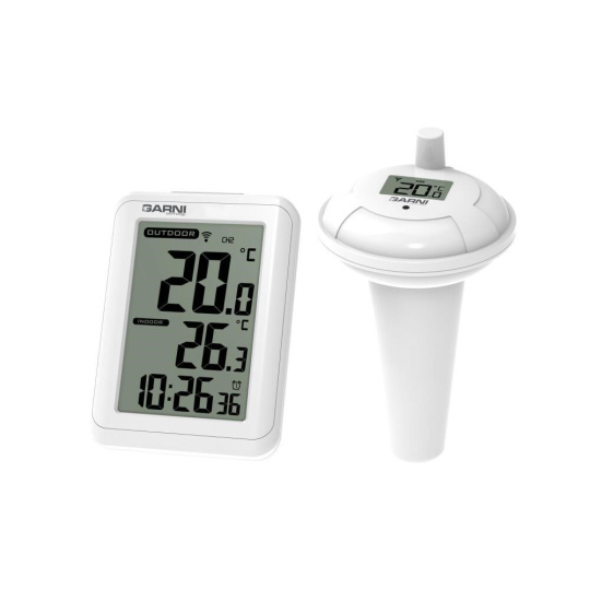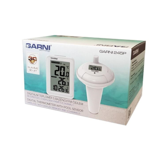Digitální teploměr s bazénovým čidlem GARNI 245P pro měření teploty vody zobrazuje také teplotu na místě hlavní jednotky a čas. Bezdrátové bazénové čidlo GARNI 065P je kompatibilní s meteorologickými stanicemi GARNI 612 Precise, GARNI 615W Precise, GARNI 615B Precise, GARNI 618W Precise a GARNI 618B Precise.