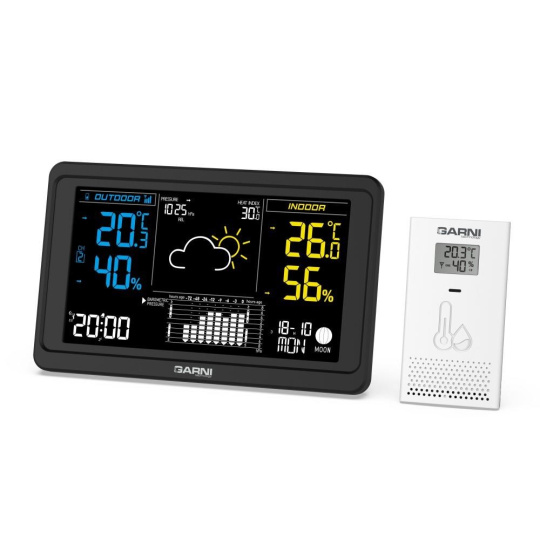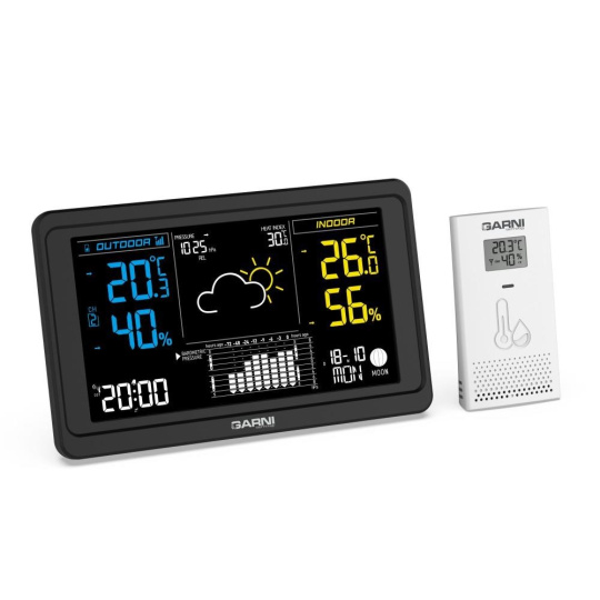 Přesná meteorologická stanice s inverzním barevným VA displejem s časem a datem řízenými rádiovým signálem DCF-77, budíkem, měřením vnitřní teploty, relativní vlhkosti, barometrického tlaku a bezdrátovým čidlem pro měření vnější teploty a relativní vlhkosti. Pro dosažení vysoké přesnosti měření teploty a relativní vlhkosti jsou použita špičková čidla švýcarské značky SENSIRION