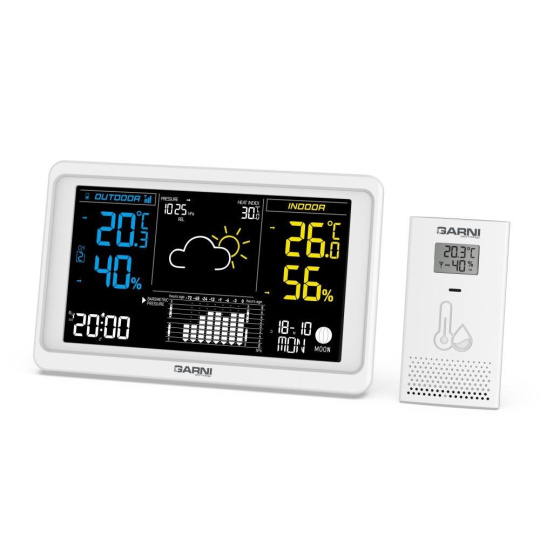 Přesná meteorologická stanice s inverzním barevným VA displejem s časem a datem řízenými rádiovým signálem DCF-77, budíkem, měřením vnitřní teploty, relativní vlhkosti, barometrického tlaku a bezdrátovým čidlem pro měření vnější teploty a relativní vlhkosti. Pro dosažení vysoké přesnosti měření teploty a relativní vlhkosti jsou použita špičková čidla švýcarské značky SENSIRION