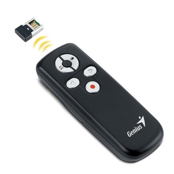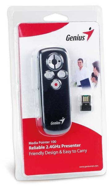 Zcela nová pomůcka Media Pointer 100 od firmy Genius je nejlepší nástroj pro použití při prezentacích. Pokročilá 2,4 GHz bezdrátová technologie poskytuje pracovní rozsah až 10 metrů bez interference. Je to užitečný nástroj pro schůzky, projevy či školení na cestách.