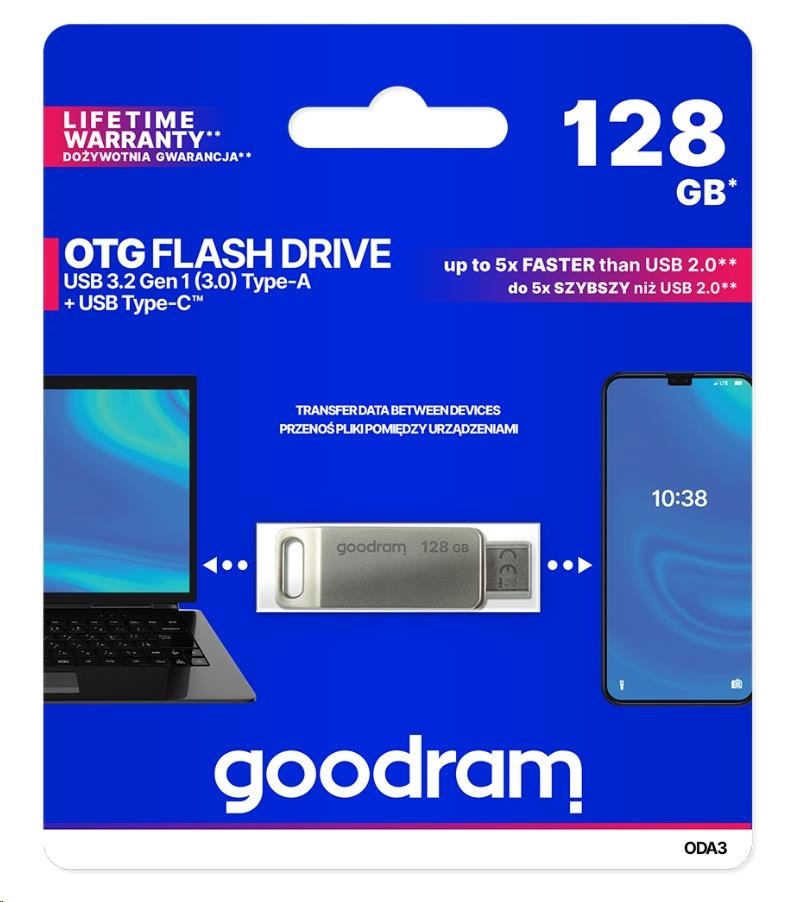 Type-C™ is becoming the most popular USB type used to transfer data between all electronic devices. The growing popularity of this solution is supported by the fact that manufacturers of next gen laptops, smartphones, PCs and other devices are increasingly equipping their products with an additional “C” next to the standard type A connector or choose only Type-C™. GOODRAM OTG ODA is an excellent solution that will work both with an old and new electronic devices generation laptops, smartphones and PCs. The ODA Flash drive is equipped with two fast USB 3.2 connectors: one standard type A and the Type-C™, which means that data transfer between devices of different generations has never been so easy and fast.