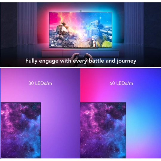 LED pásky se instalují na zadní stranu TV o velikosti 55-65 palců. Je možné je rozdělit na více barevných částí a kombinovat jejich barevné provedení. Objevte vysokou úroveň zážitku při sledování filmů nebo hraní her s dynamickými barvami vyzařujícími ze všech koutů vaší obrazovky (není optimalizováno pro zakřivené televizory). V balení se nachází 4 propojené pásky, které se instalují na zadní stranu TV nebo monitoru.