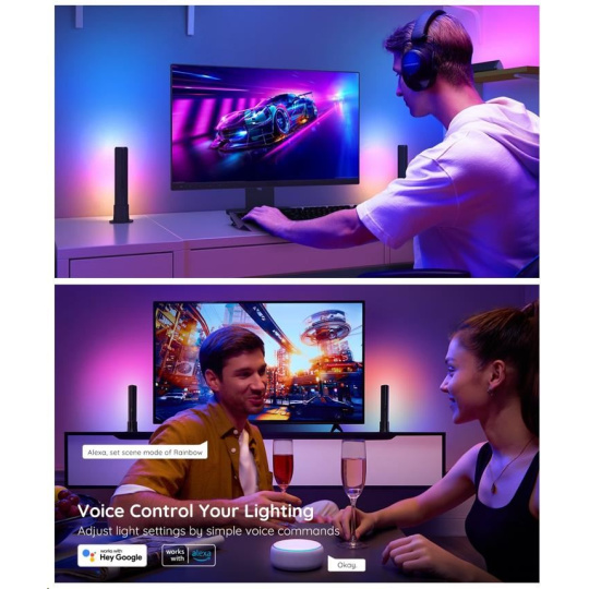 Vytvořte si ideální filmovou nebo herní atmosféru pomocí jednoduchých hlasových příkazů. Světla jsou kompatibilní s asistenty Alexa, Google Assistant a Siri. WiFi modul je zabudován v kameře, pouze kamera je připojena k ovládacímu boxu. Nyní můžete Govee Flow Plus zapnout/vypnout, upravit úrovně jasu nebo změnit jejich barvu pomocí hlasových příkazů z pohodlí své pohovky nebo postele. Ovládat světla je možné také přes ovládací jednotku Control Box nebo přes aplikaci ve smartphonu nebo tabletu.