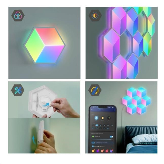 Vylepšete interiér a herní, filmové a hudební zážitky s designovým světlem Hexa PRO 3D Smart LED. Díky technologii RGBIC zobrazuje až 57 barev najednou. Barevnost si můžete nastavit po jednotlivých sekcích a kreativně si pohrát s 3D efektem osvětlení. Celkově umí zobrazit až 16 milionů barev s intenzitou 1-100%. Určitě si vyberete z mnoha režimů osvětlení a při poslouchaní oblíbené hudby si můžete zvolit také ze 6 rytmických režimů. Světla se ovládají hlasem přes Siri, Amazon Alexa nebo Google Assistant nebo přes aplikaci Govee Home na chytrém telefonu nebo tabletu. Světlo je určeno na instalaci na zeď a jeho tvar si můžete přizpůsobit podle vlastní fantazie. Jednoduchá instalace bez vrtání s životností až 50.000 hodin.
