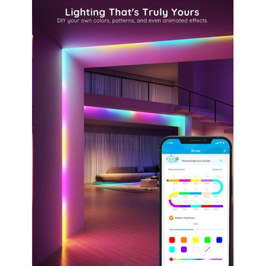 Spravujte nastavení barev a intenzity světla jednoduše pomocí aplikace Govee Home. Aplikace je zdarma ke stažení v Google Play a AppStore. Navíc získáte přístup k funkci časovače, DIY barvám, režimu videa, synchronizaci hudby a režimům scény. Rovněž si můžete pomocí časovače nastavit automatické vypnutí a zapnutí, třeba podle doby usínání a vstávaní. Ovládání hlasem je možné přes Siri, Amazon Alexa a Google Assistant.