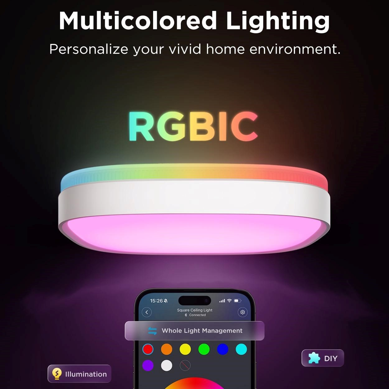 Proměňte svůj prostor pomocí dynamického vícebarevného osvětlení. Chytré stropní svítidlo Govee nabízí živé a přizpůsobitelné osvětlení, které se snadno sladí s vaší náladou i stylem. Díky technologii RGBIC+WW můžete zobrazovat 16 mil. barev a odstíny bílé současně a pohodlně ovládat celé světlo prostřednictvím intuitivní mobilní aplikace. Ať už jde o atmosféru, zábavu nebo každodenní osvětlení, užijte si naprostou volnost v režimu DIY a efekty, které oživí váš domov.