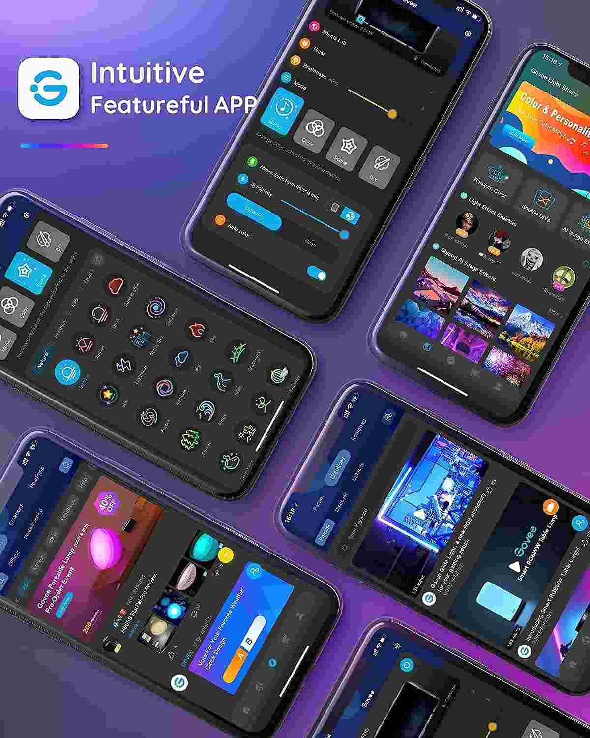 Aplikace Govee Home nabízí víc než 64 scénických a dynamických režimů na každou příležitost. Barevné kombinace si můžete nastavit podle svých preferencí, vkusu a vaší momentální nálady.