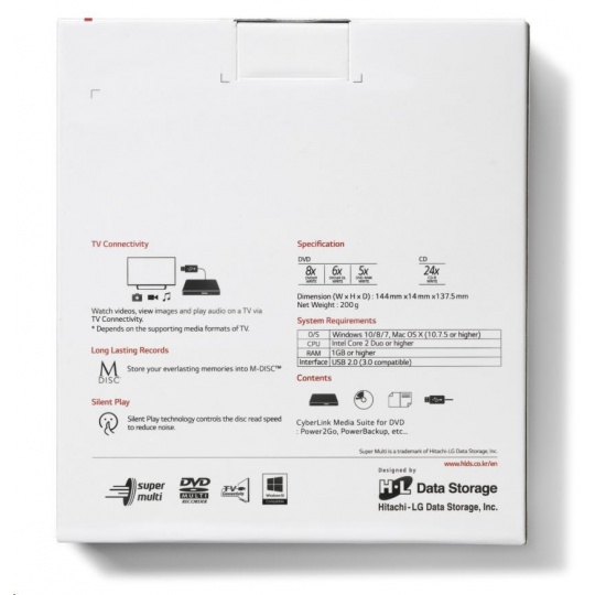HITACHI LG - externí mechanika DVD-W/CD-RW/DVD±R/±RW/RAM GP60NW60, Slim, White, box+SW