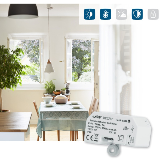 Spínací akční člen (HmIP-FSM) se montuje do standardní zápustné krabice pod omítku nebo do krabice pro povrchovou montáž s připojením do sítě 230 V. Bezdrátová komunikace nabízí možnost instalace bez potřeby druhotné kabeláže. To znamená, že akční člen lze umístit v místě připraveného nebo stávajícího elektrického rozvodu sítě 230 V.