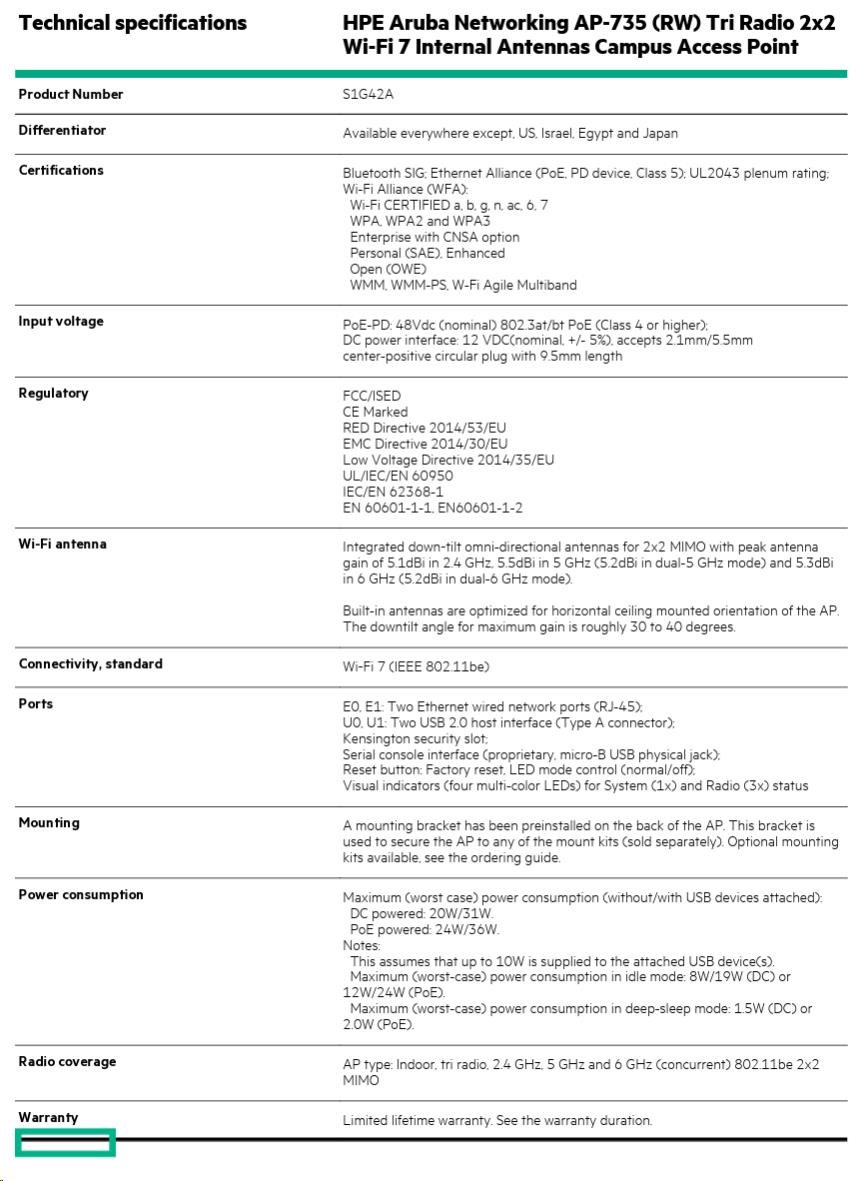HPE Aruba Networking AP-735 (RW) Tri Radio 2x2 Wi-Fi 7 Internal Antennas Campus Access Point.