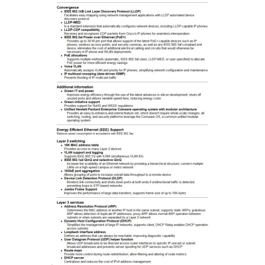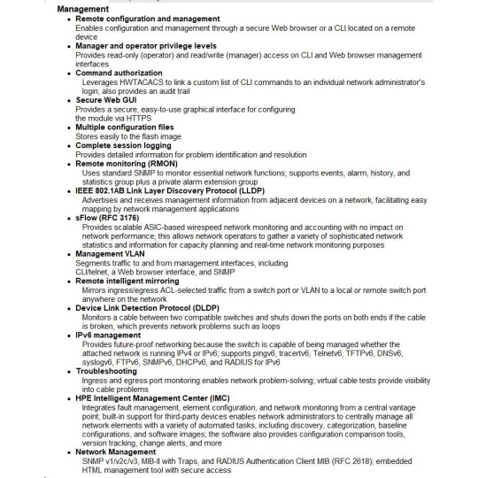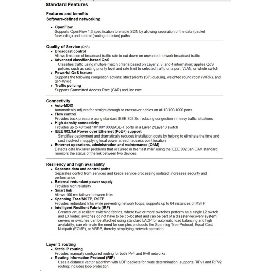 • Intelligent Resilient Fabric (IRF) Technology: Unifies multiple switches into one logical device, improving network resilience, performance, and availability while simplifying operations.