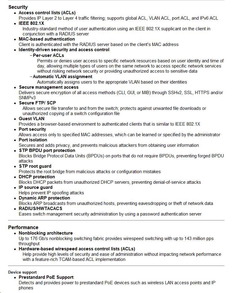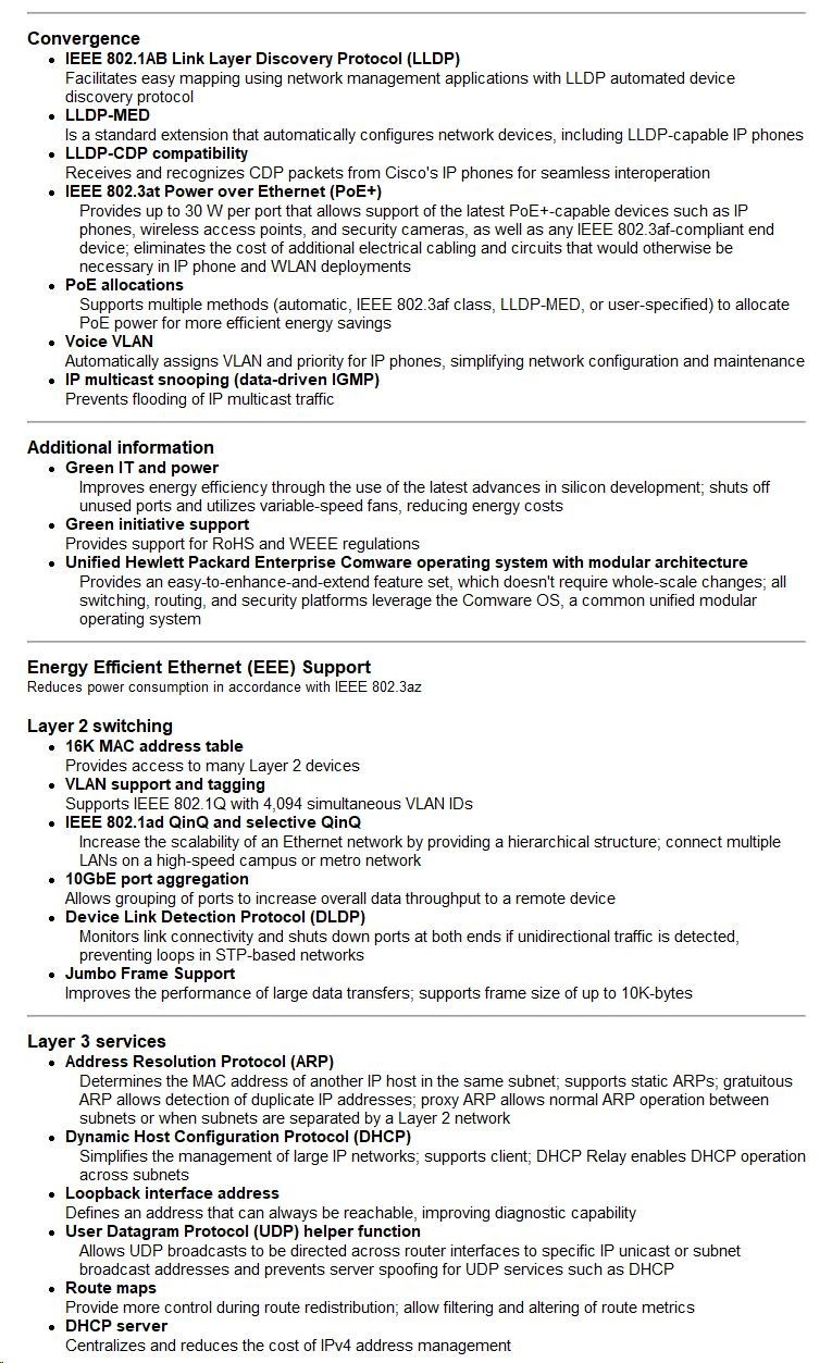 Unique Intelligent Resilient Fabric (IRF) technology creates a virtual fabric by managing several switches as one logical device, which increases network resilience, performance, and availability, while reducing operational complexity. These switches provide Gigabit Ethernet access and can be used at the edge of a network or to connect server clusters in small data centers.