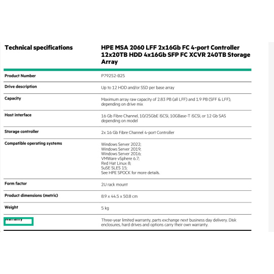 HPE MSA 2060 LFF 2x16Gb FC (4port Controller+4x16Gb SFP FC XCVR) 240TB (12x20TB/7.2k SATA) Storage Array Smart Choice