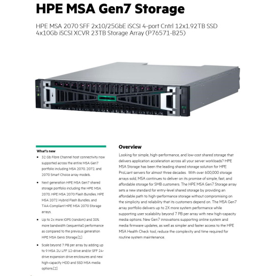 HPE MSA 2070 SFF 2x10/25GbE iSCSI 4-port Cntrl 12x1.92TB SSD 4x10Gb iSCSI XCVR 23TB Storage Array Smart Choice