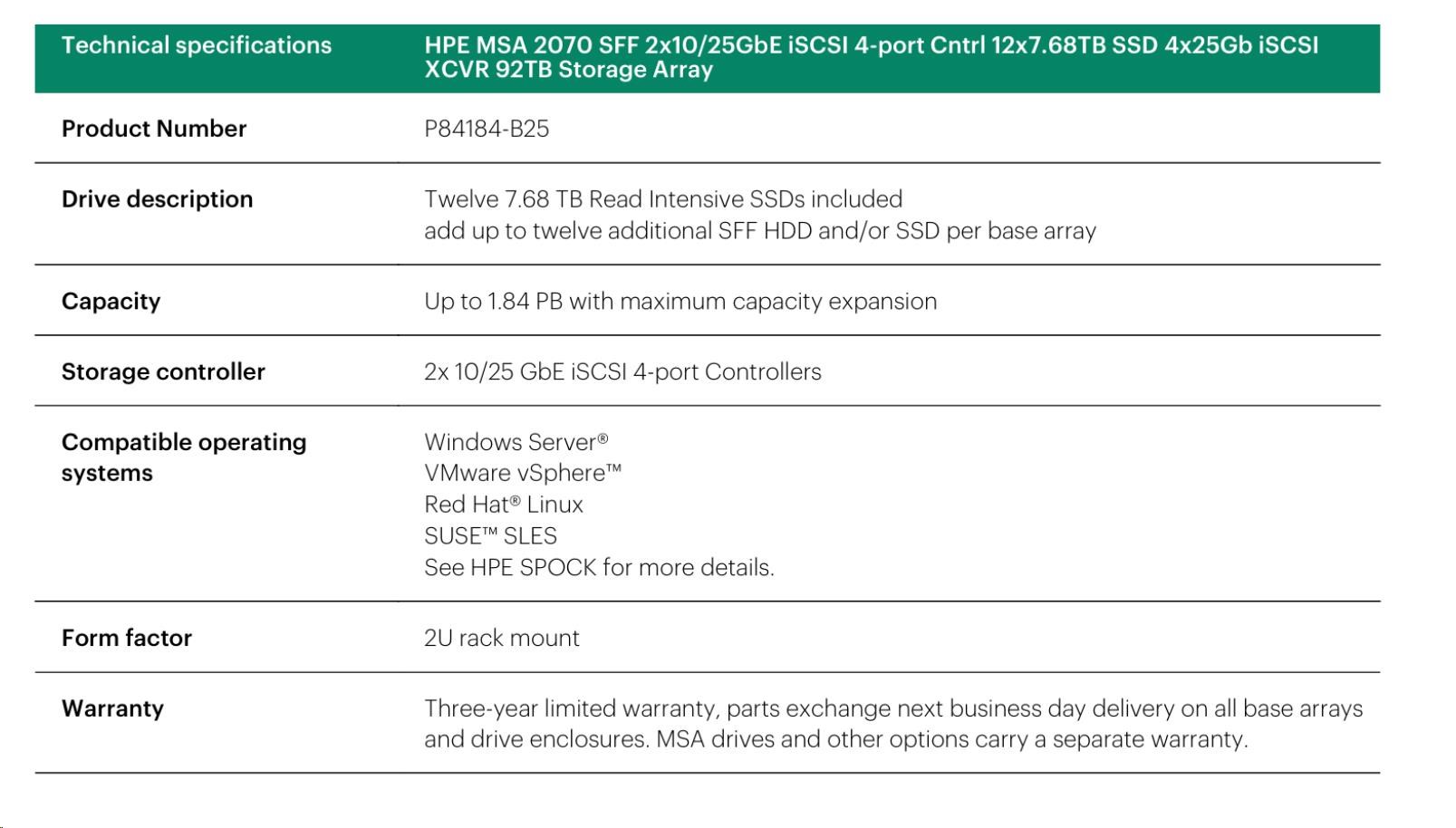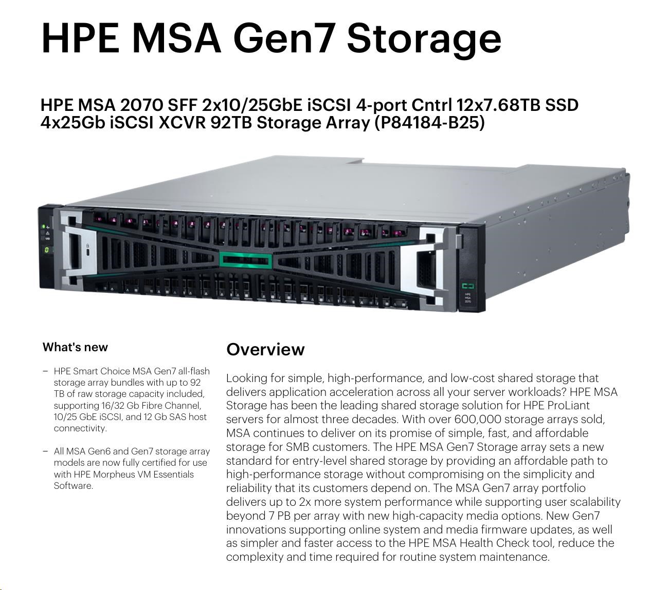 HPE MSA 2070 SFF 2x10/25GbE iSCSI 4-port Controller 12x7.68TB SSD 4x25Gb iSCSI XCVR 92TB Storage Array Smart Choice.