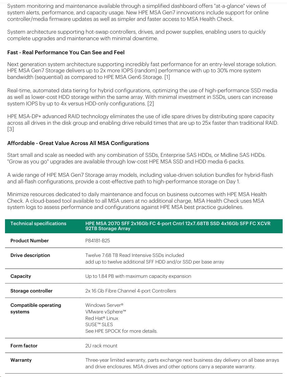 HPE MSA 2070 SFF 2x16Gb FC 4-port Controller 12x7.68TB SSD 4x16Gb SFP FC XCVR 92TB Storage Array Smart Choice.