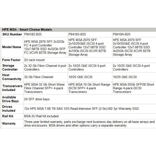 HPE MSA 2070 SFF 2x32Gb FC 4-port Controller 12x7.68TB SSD 4x32Gb SFP FC XCVR 92TB Storage Array Smart Choice.