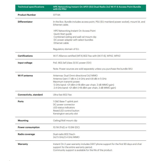 HPE Networking Instant On AP21 (EU) Dual Radio 2x2 Wi-Fi 6 Access Point Bundle with EU PSU