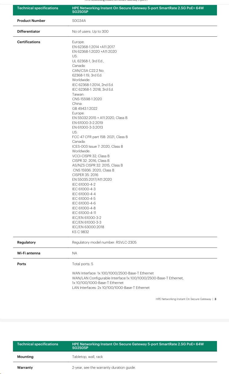HPE Networking Instant On Secure Gateway SG2505P(S0G34A)