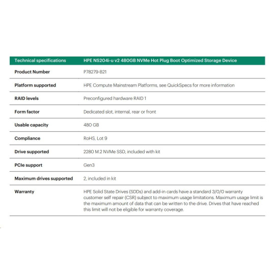 HPE NS204i-u v2 480GB NVMe Hot Plug Boot Optimized Storage Device P78279-B21 RENEW.