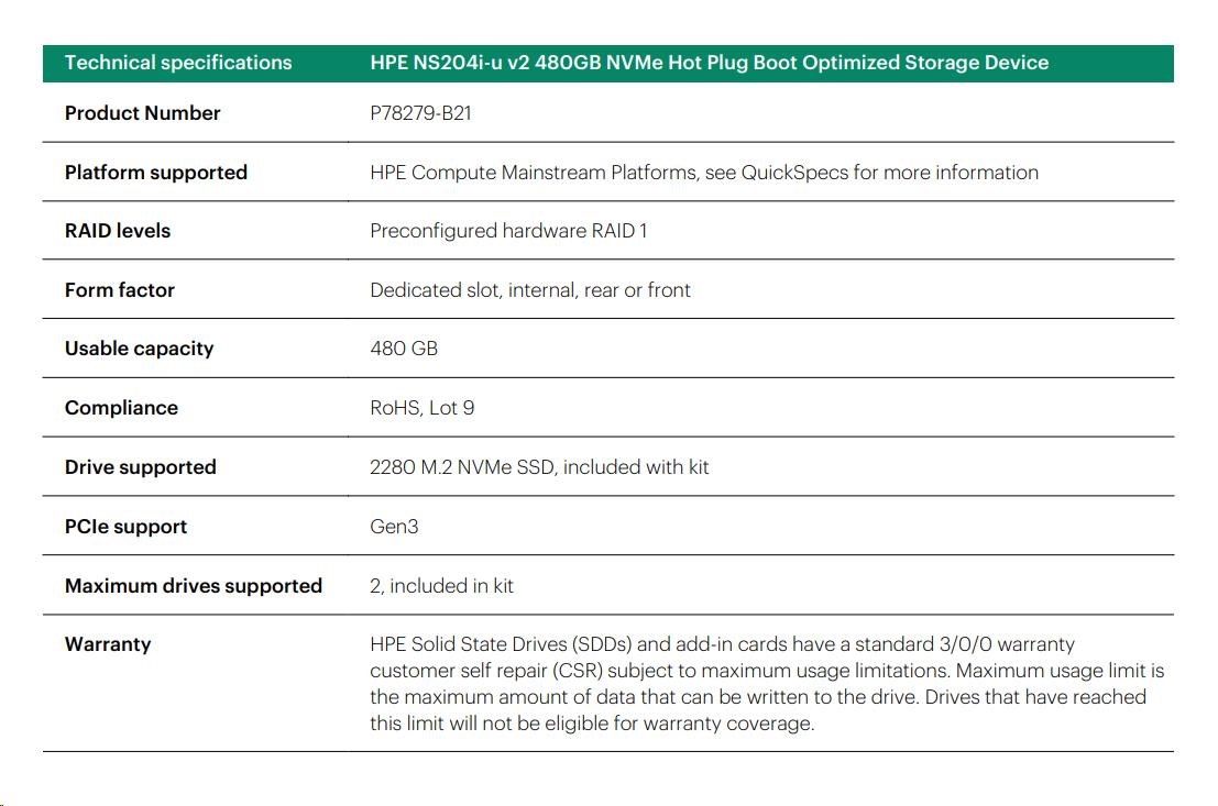 HPE NS204i-u v2 480GB NVMe Hot Plug Boot Optimized Storage Device P78279-B21 RENEW.
