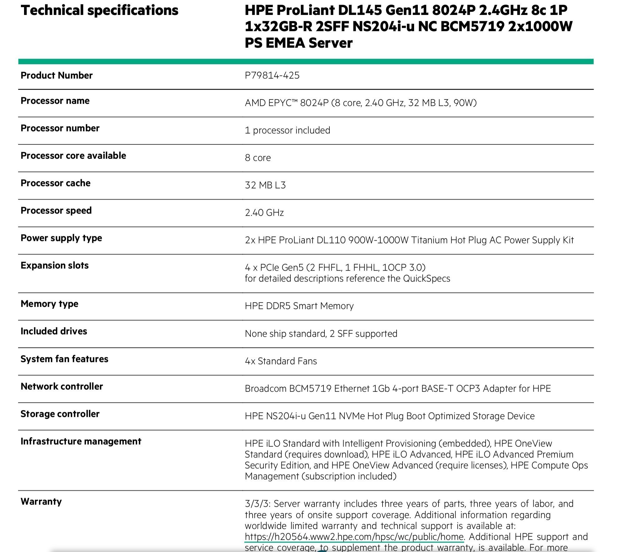 3/3/3: Server warranty includes 3 years of parts, 3 years of labor, and 3 years of onsite support coverage. Additional information regardingworldwide limited warranty and tech support is available at:https://h20564.www2.hpe.com/hpsc/wc/public/home. Add HPE support and service coverage to supplement the product warranty https://www.hpe.com/support