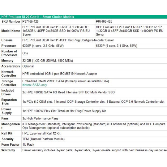 HPE PL DL20g11 6333P (3.1G/6C12T) 1x32G 2x480GB VROC 4SFF 1x1000W 4x1G NBD333 Smart Choice