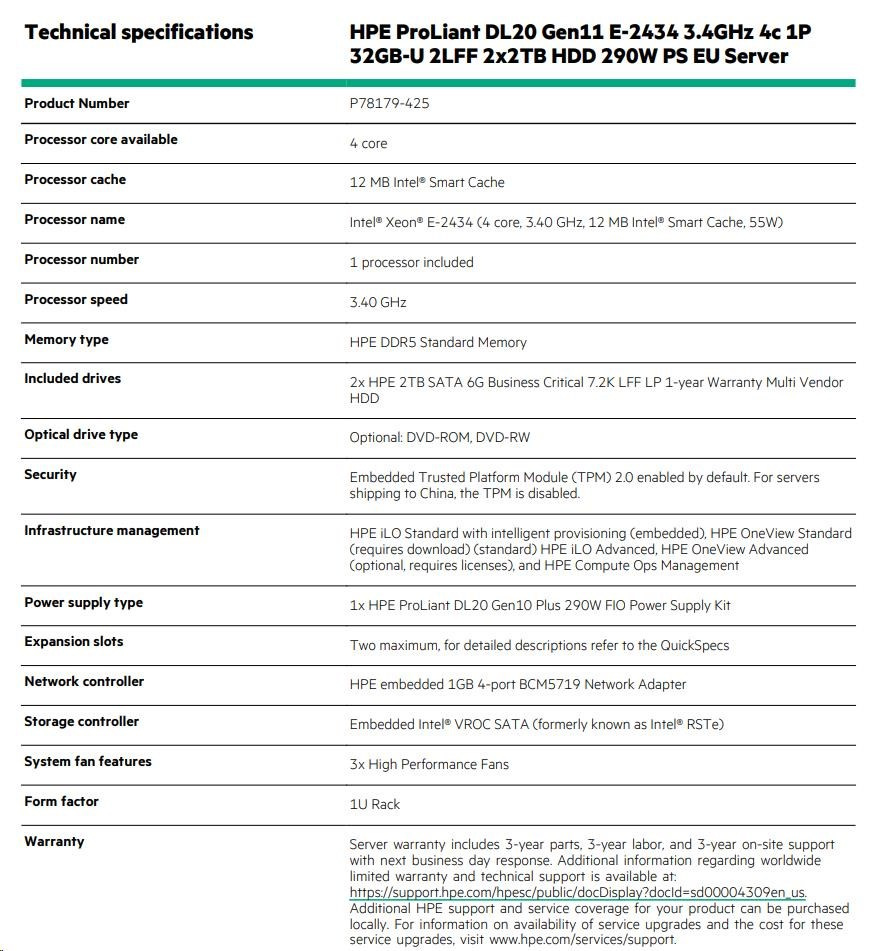 HPE PL DL20g11 E-2434 (3.4G/4C) 1x32G 2x2TB/7.2k SATA VROC 2LFF-HP 4x1Gb 290W Smart Choice