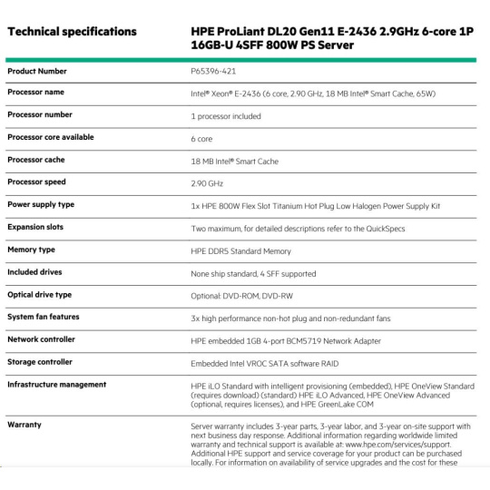 HPE PL DL20g11 E-2436 (2.9G/6C) 16G 4SFF VROC 800W 4x1G NBD333.