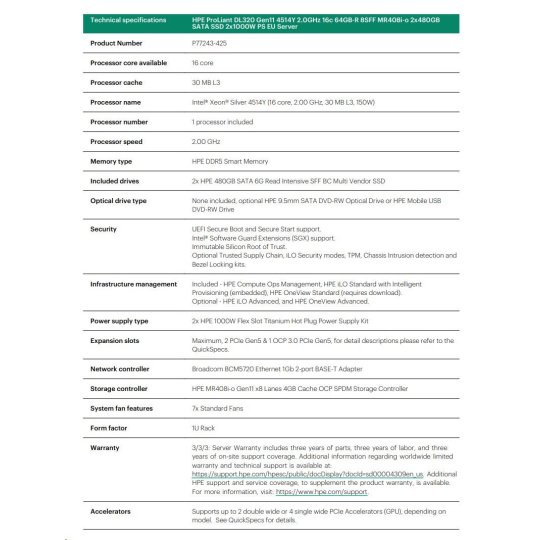 Model Name HPE PL DL320g11 4514Y (2.0/16C/4400) 2x32G 2x480G SATA SSD MR408i-o 8SFFBCU3 2x1000W 2x1Gb 1U EIR