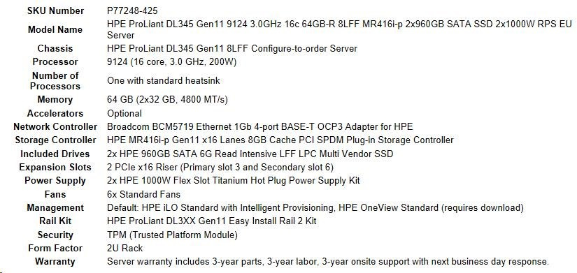 Model Name | HPE ProLiant DL345 Gen11 9124 3.0GHz 16c 64GB-R 8LFF MR416i-p 2x960GB SATA SSD 2x1000W RPS EU Server |