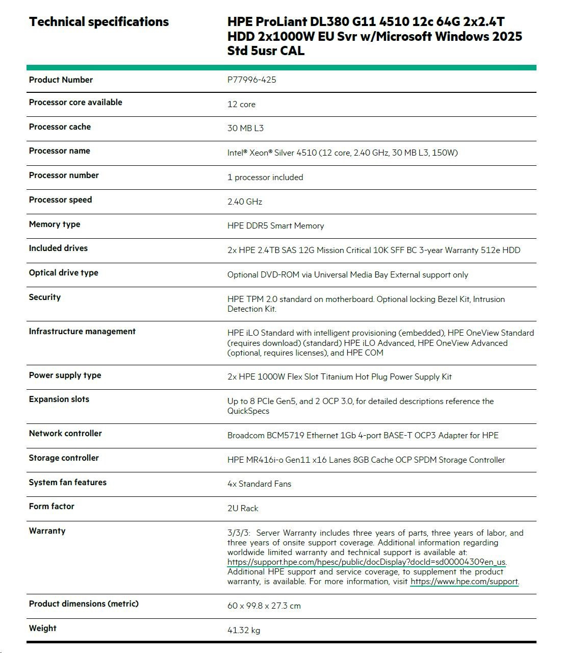 Model Name HPE PL DL380g11 4510 (2.4/12C) 2x32G (p64706) 2x2.4TB/10k MR416i-o/8G 2x1000W 8SFF 4x1G WS2025STD Smart Choice