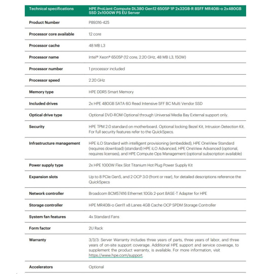 HPE PL DL380g12 6505P (2.2/12C) 2x32G (P69727) 2x8TB MR416i-o 2x1000W 10GbE NBD333 Smart Choice.