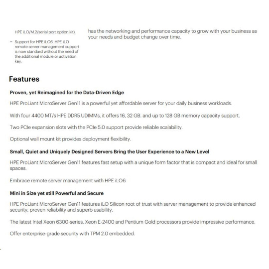 HPE ProLiant MicroServer Gen11 poskytuje cenově dostupný kompaktní, ale výkonný server základní úrovně, který si můžete přizpůsobit pro místní, okrajové, hybridní cloudy nebo dokonce pracovní zátěže náročné na výkon datového centra. Má ultra mini věžový tvarový faktor a lze jej umístit naplocho nebo svisle nebo namontovat na stěnu v závislosti na prostředí zákazníka. Nejnovější podporované procesory Intel Xeon® E a Pentium® dodávají serveru výpočetní výkon, zabezpečení a vzdálenou správu s křemíkovým kořenem důvěry HPE iLO. Spolu s dalšími vylepšeními, jako jsou 4 sloty DIMM pro paměti DDR5 a 2 sloty PCIe, ať už chcete server pro všeobecné použití, NAS nebo dokonce virtualizační server, budete překvapeni, kolik toho můžete z tohoto malého a cenově dostupného serveru vytěžit.