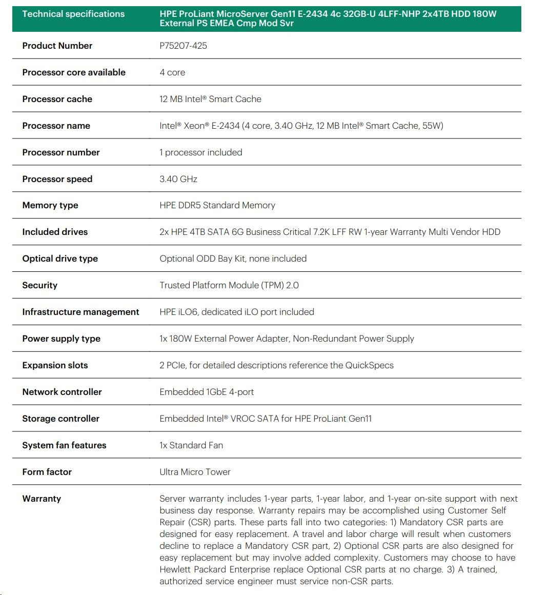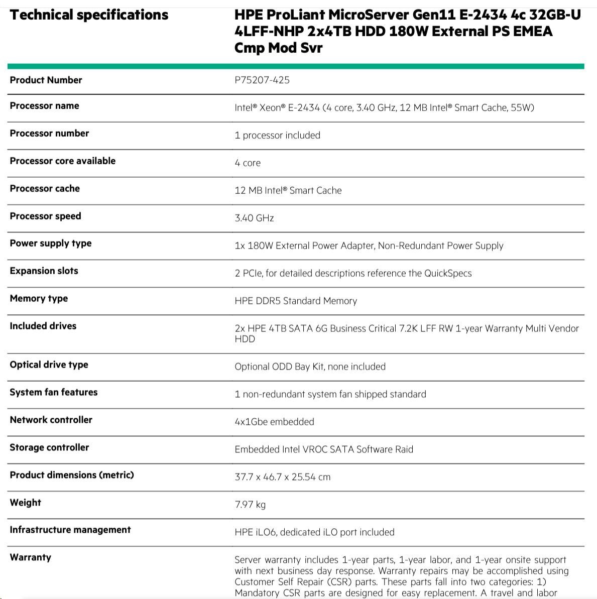 Model Name HPE ProLiant MicroServer Gen11 E-2434 4c 32GB-U 4LFF-NHP 2x4TB HDD 180W External PS EMEA Cmp Mod Svr