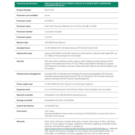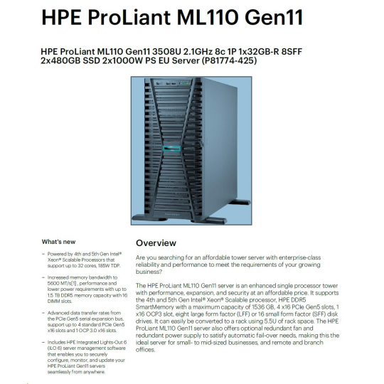 HPE ProLiant ML110 Gen11 3508U 2.1GHz 8c 1P 1x32GB-R 8SFF 2x480GB SSD 2x1000W PS EU Server