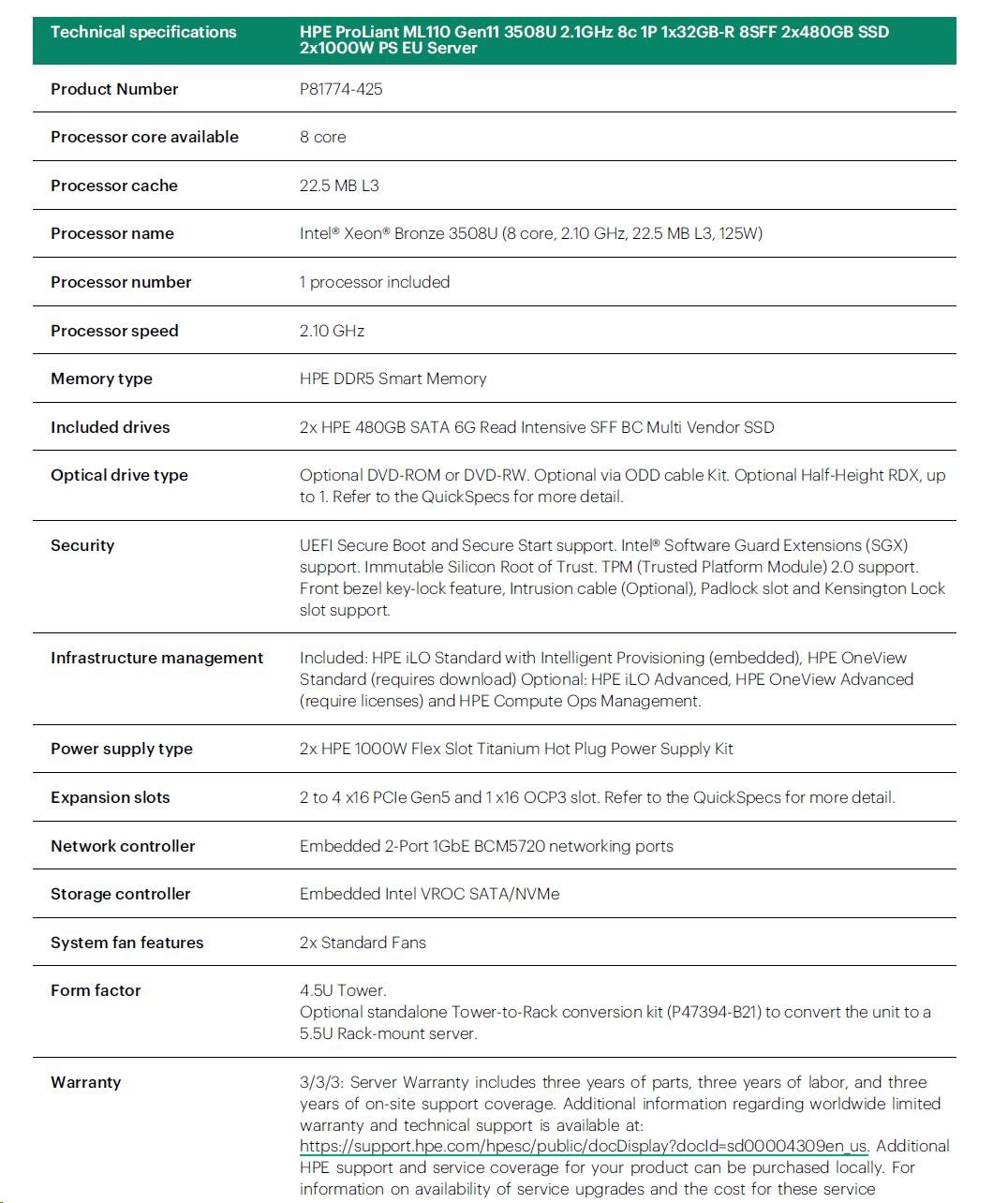 Model Name | HPE ProLiant ML110 Gen11 3508U 2.1GHz 8c 1P 1x32GB-R 8SFF 2x480GB SSD 2x1000W PS EU Server |
