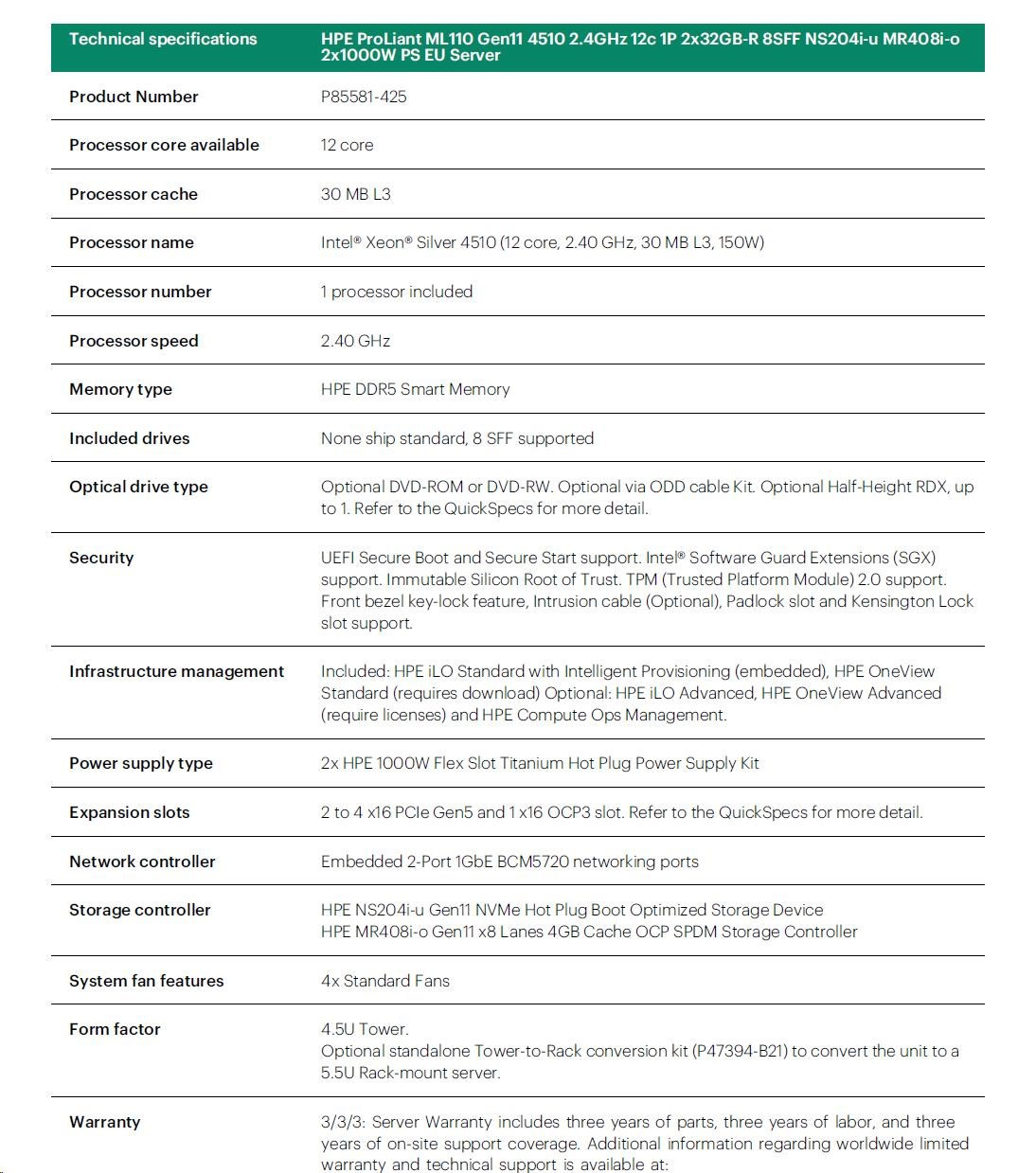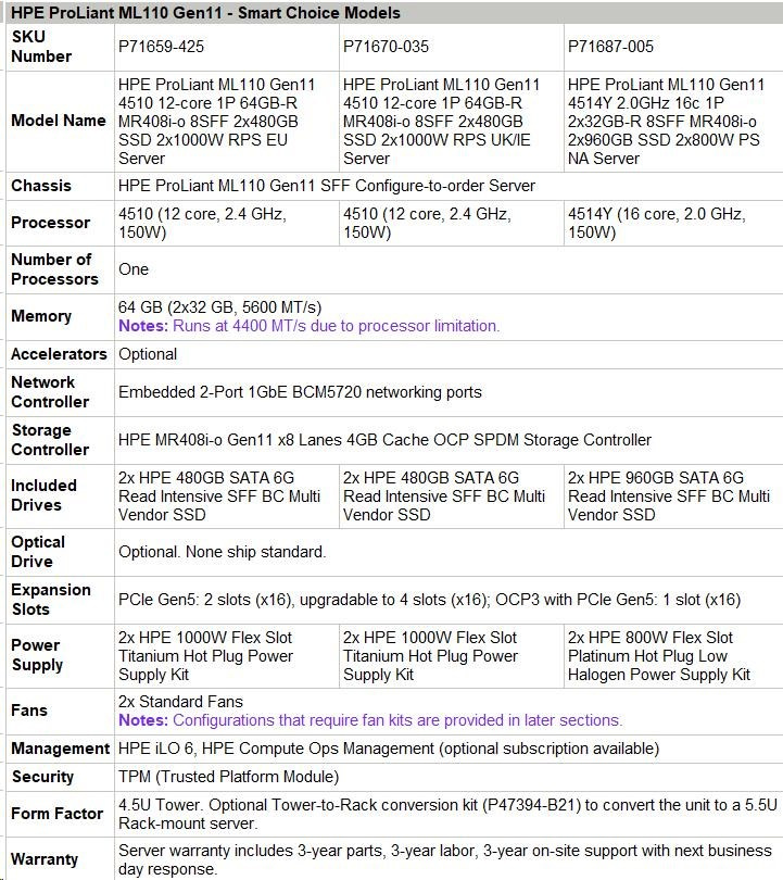 HPE PL ML110g11 4510 (2.4G/12C) NS204(2x480) 2x32G (P64706) MR408i-o 2x1000W 8SFF 2x1G NBD333 Smart Choice