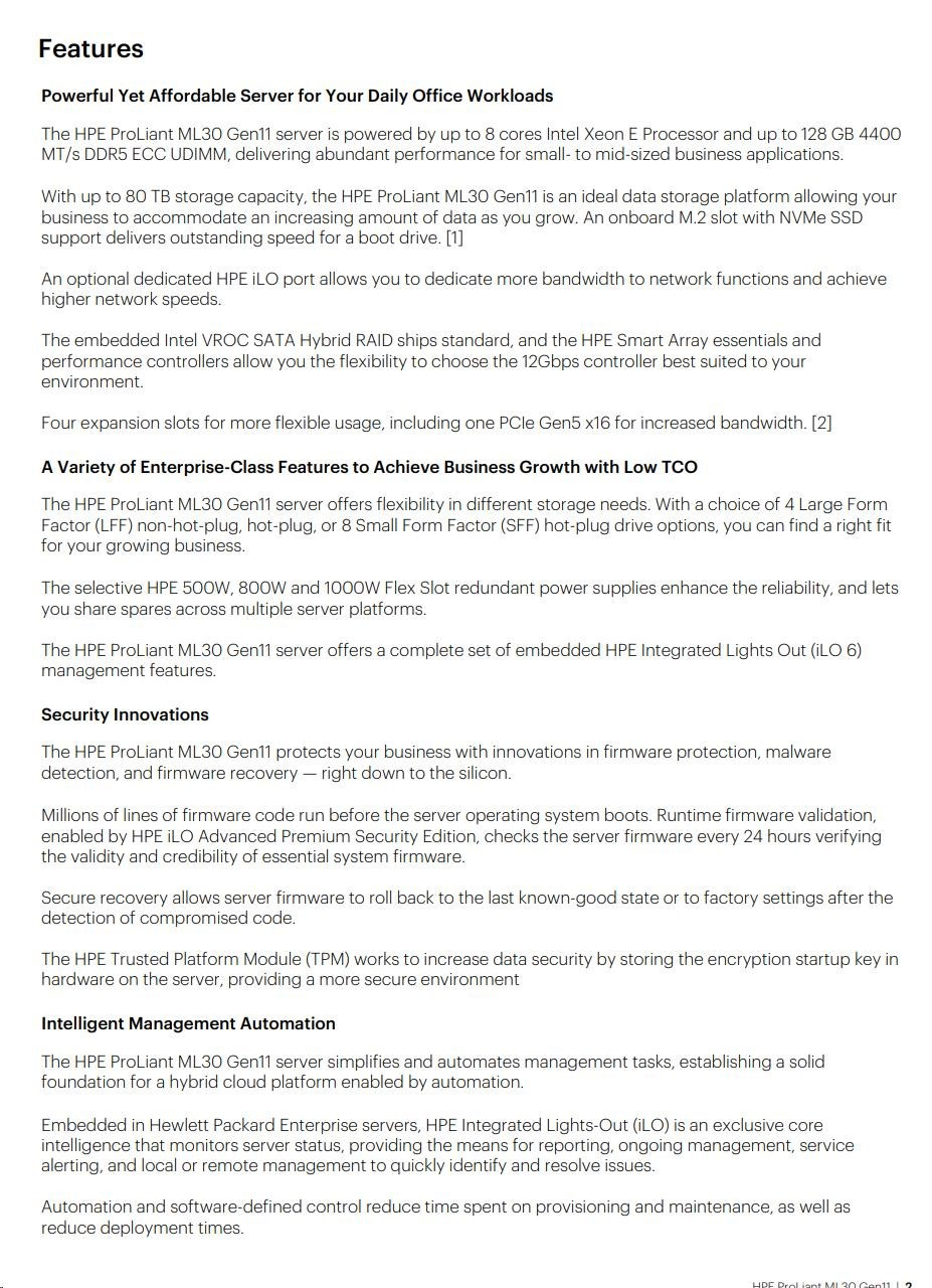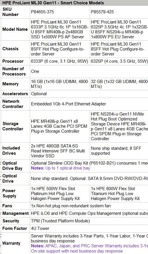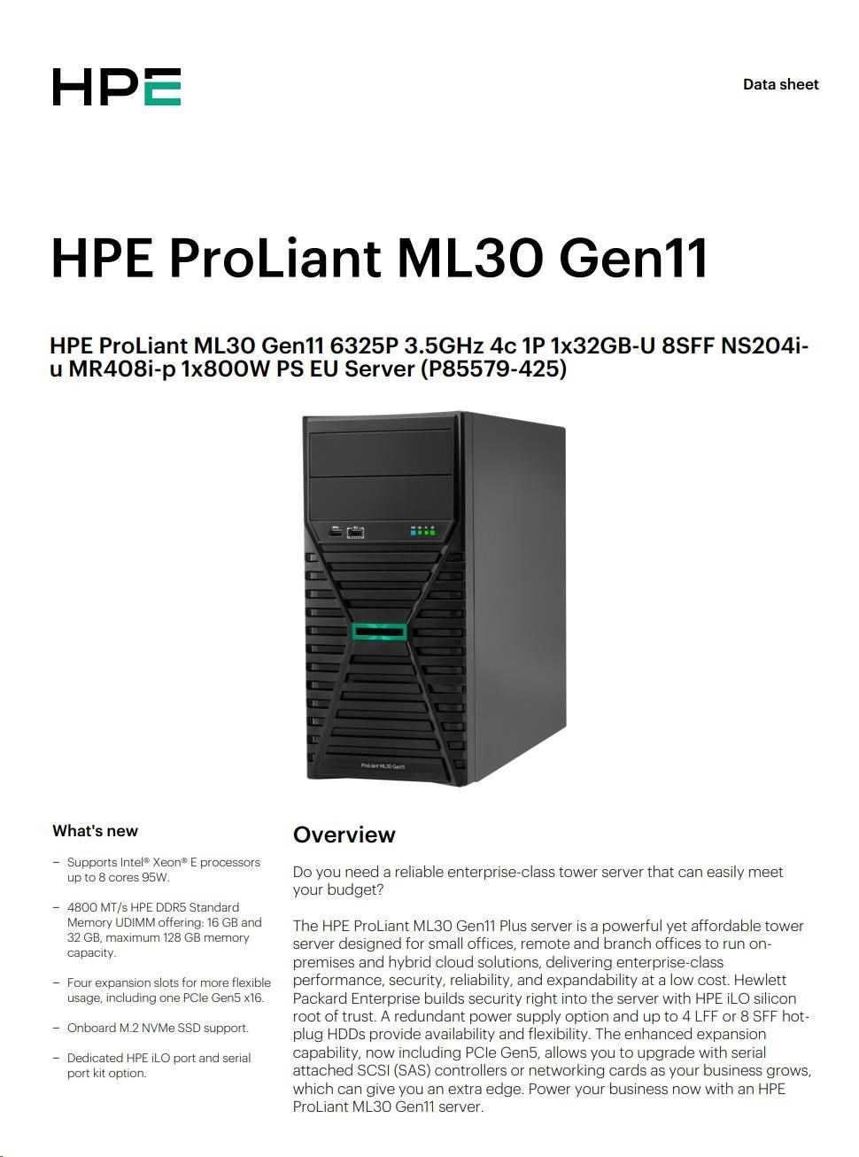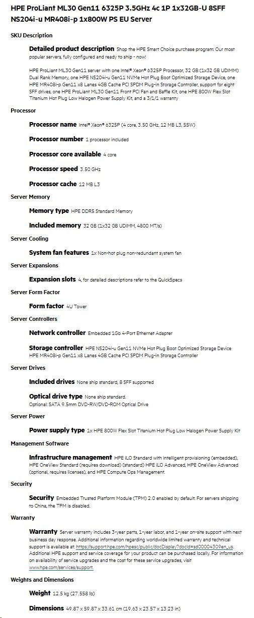 HPE PL ML30g11 6325P (3.5G/4C8T) 1x32G 8SFF NS204i-u(2x480g) MR408i-p/4G 2x800W 3/1/1 Smart Choice.