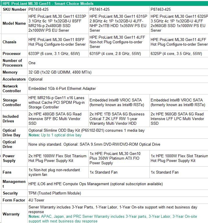 HPE PL ML30g11 6315P (2.8-5.2G/4C4T) 1x32G 2x1TB SATA 4LFF-NHP 1x350 VROC 4p1G NBD311 Smart Choice.