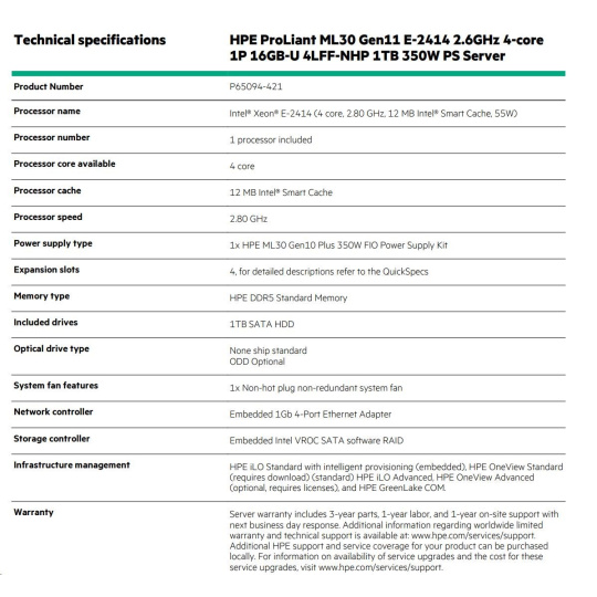 HPE PL ML30g11 E-2414 (2.6G/4C4T) 16G 1TB SATA 4LFF NHP VROC 350Wn