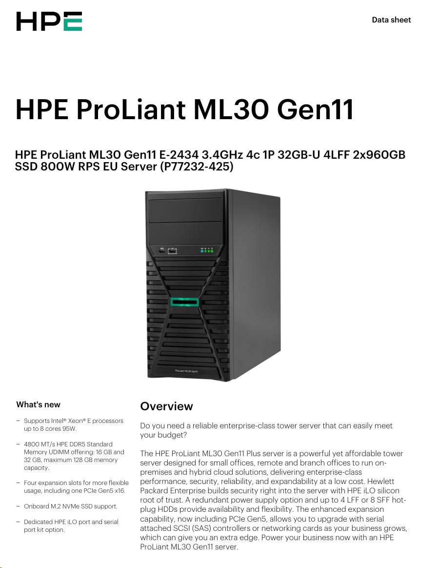 Model Name | HPE ProLiant ML30 Gen11 E-2434 3.4GHz 4c 1P 32GB-U 4LFF 2x960GB SSD 800W RPS EU Server |