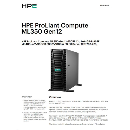 HPE PL ML350 Gen12 6505P (2.2/12C) 1x64G (P69728) 2x960G MR408i-o 8SFF 2x1000W 1GbE NBD333 Smart Choice.