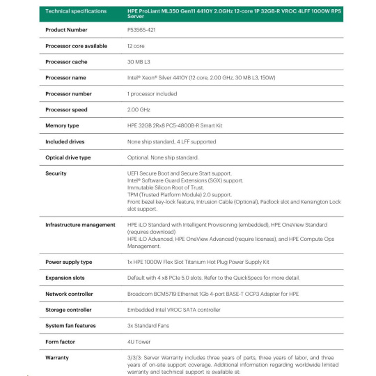 HPE PL ML350g11 4410Y (2.0G/12C) 1x32G VROC 4-12LFF 4x1Gb 1x1000W iLo NBD333
