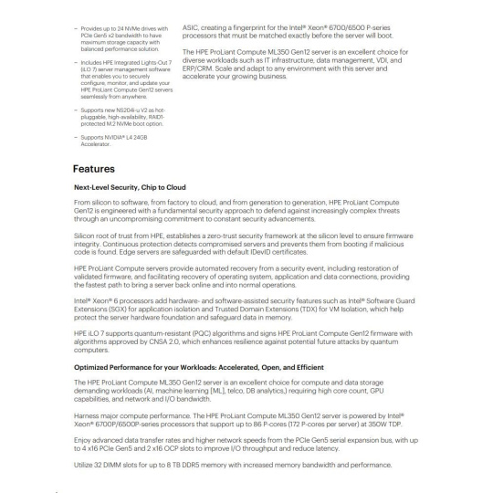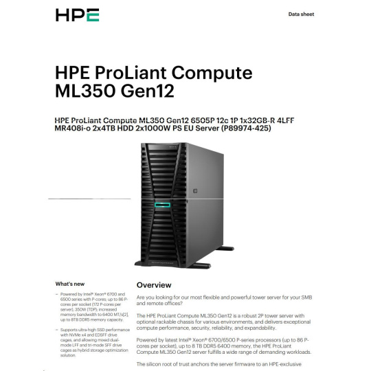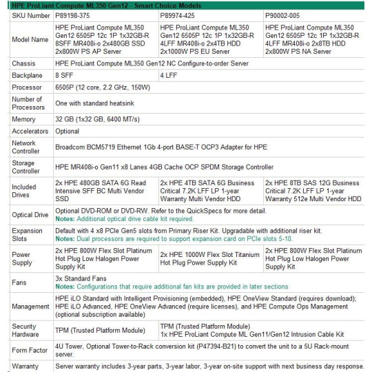 HPE PL ML350g12 6505P (2.2/12C) 1x32G (P69728) 2x4TB 4LFF MR408i-o2x1000W 1GbE NBD333 Smart Choice.
