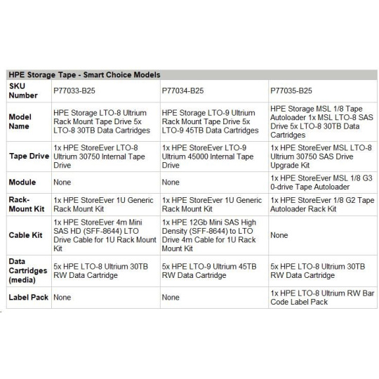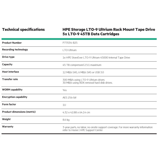 Technical specifications HPE Storage LTO-9 Ultrium Rack Mount Tape Drive 5x LTO-9 45TB Data Cartridges