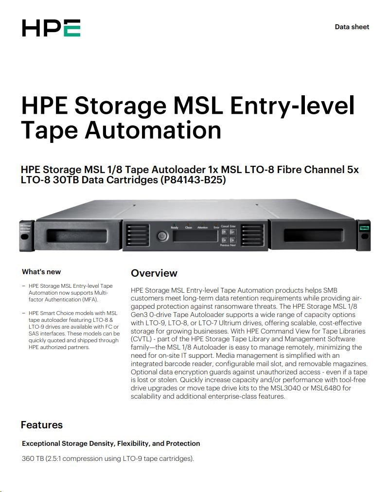 HPE Storage MSL 1/8 Tape Autoloader 1x MSL LTO-8 Fibre Channel 5x LTO-8 30TB Data Cartridges.