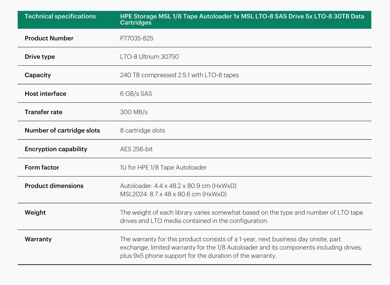HPE Storage MSL 1/8 Tape Autoloader 1x MSL LTO-8 SAS Drive 5x LTO-8 30TB Data Cartridges.