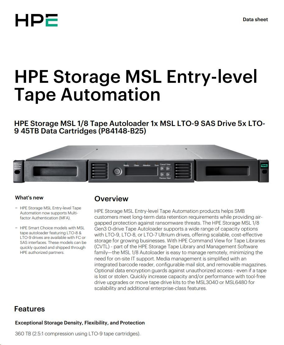 HPE Storage MSL 1/8 Tape Autoloader 1x MSL LTO-9 SAS Drive 5x LTO-9 45TB Data Cartridges.